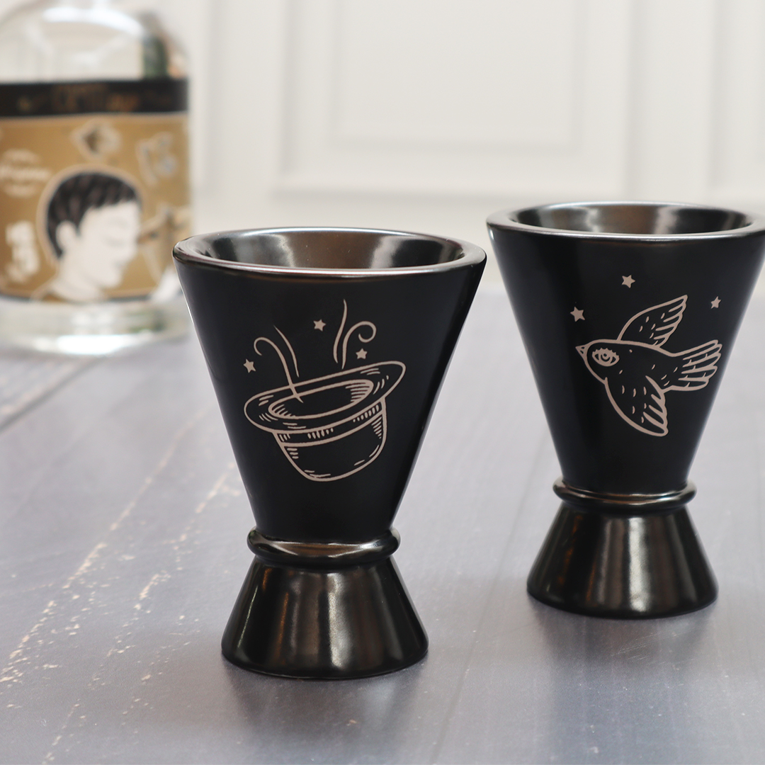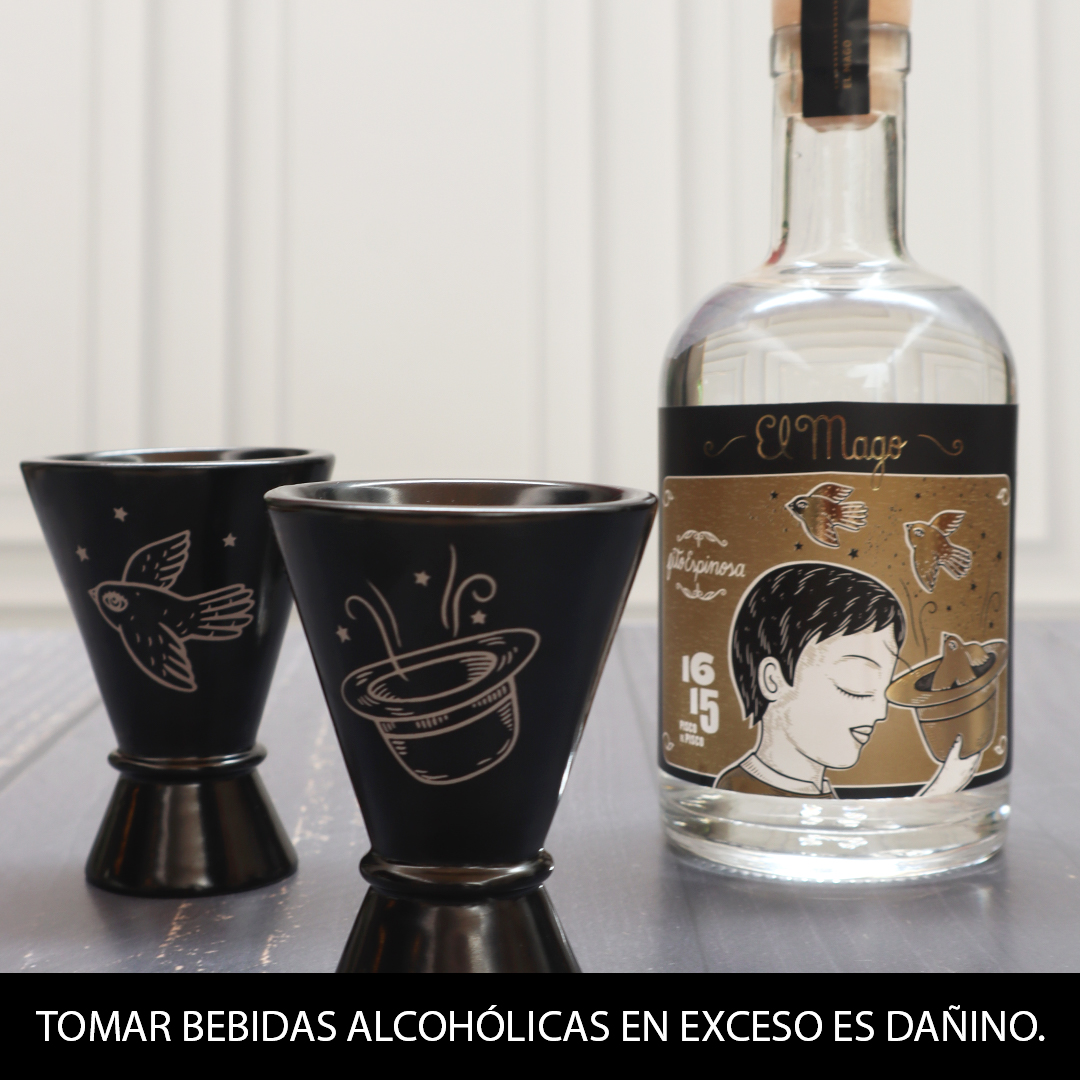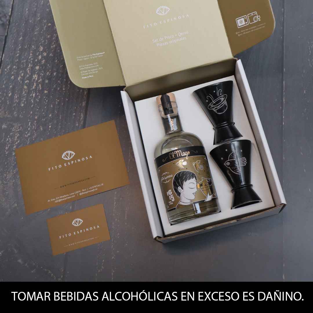 Sedoso Pisco Puro Acholado elaborado por Bodega 1615 en el Valle de Pisco, Ica ~ Perú, en Botella de 375 ml. y Elegante Etiqueta con ilustración exclusiva “El Mago” de Fito Espinosa + 02 Qeros de Porcelana. Presentación en caja ideal para regalo.