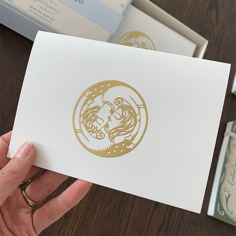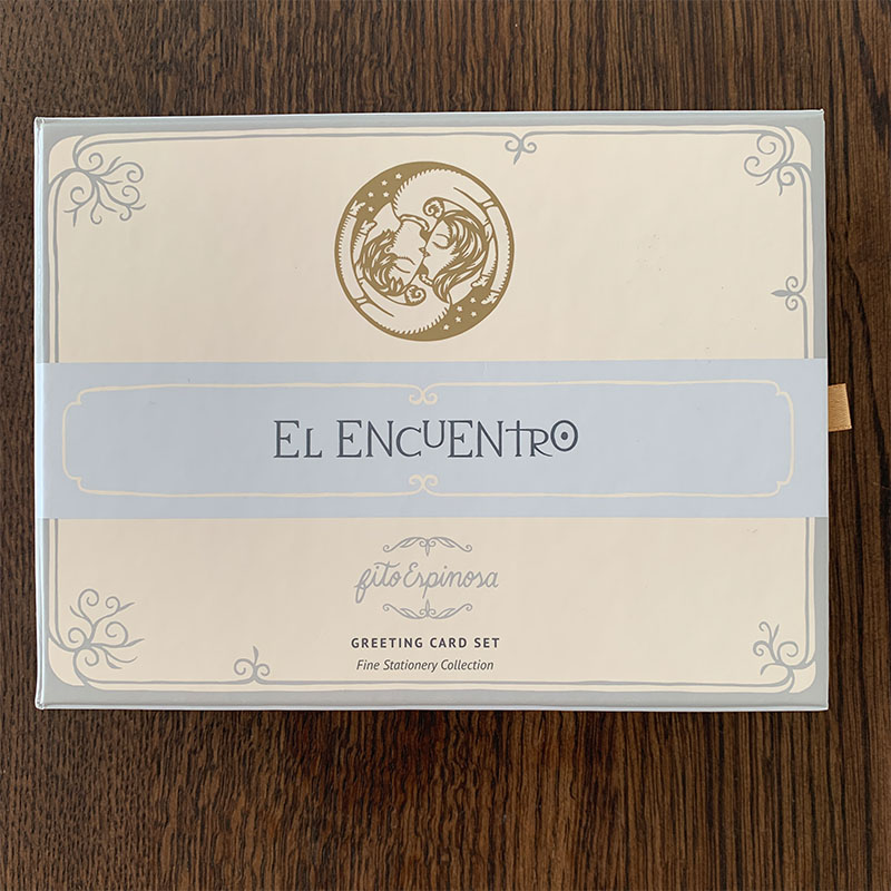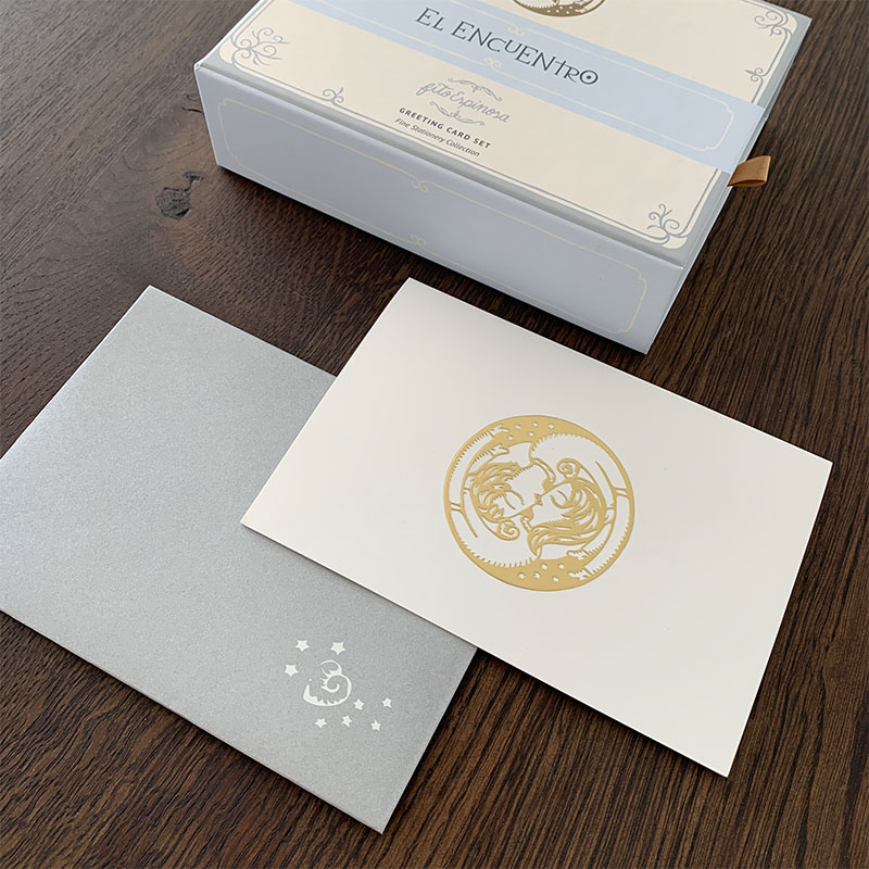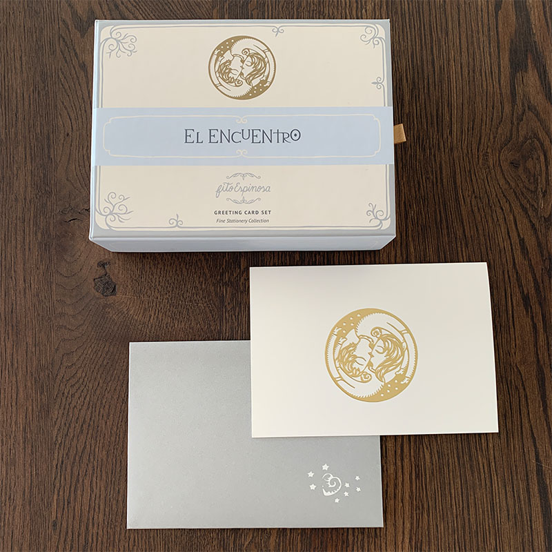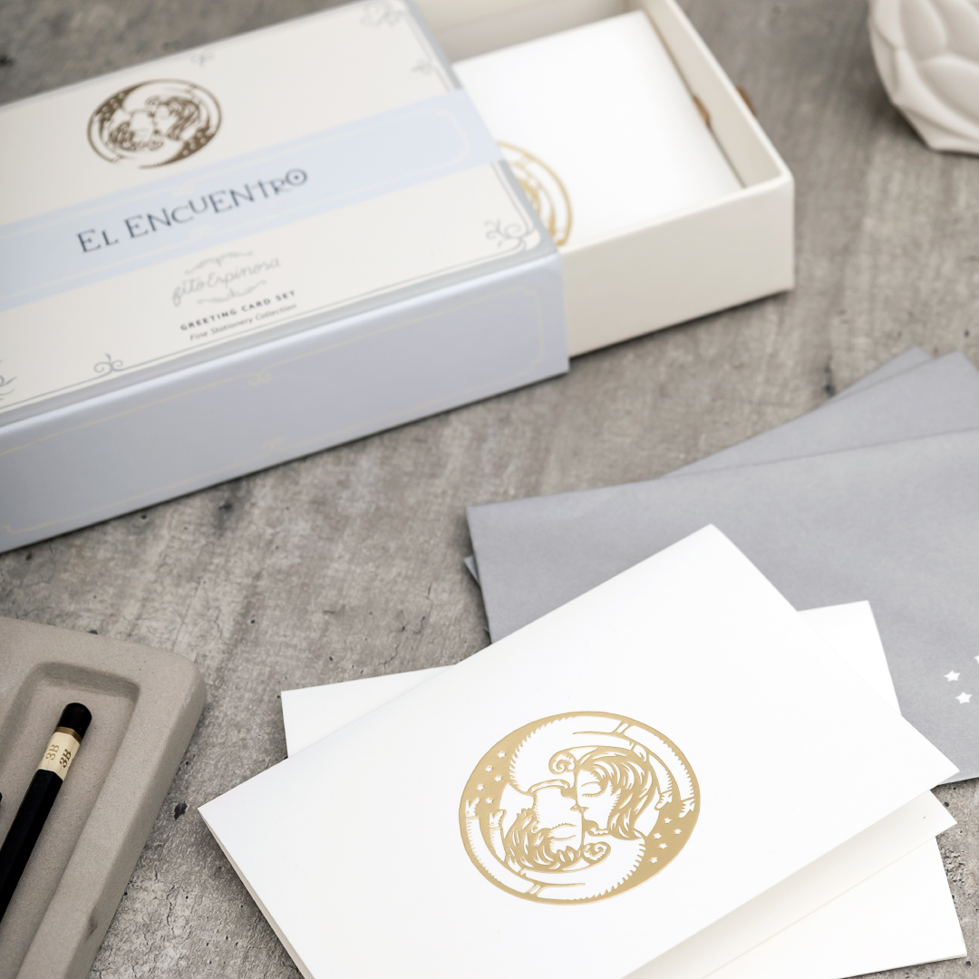 Set de tarjetas de agradecimiento o “Greeting Card Set” con temática de pareja o encuentro entre dos personas. Compuesto por una caja rígida con cintillo, 10 tarjetas y 10 sobres en papel de algodón, con símbolo ilustrado por Fito Espinosa en alto reelieve, foil dorado y decoración en plata. Idea como detalle para regalo o enviar un mensaje especial. Pieza de papelería fina con certificación FSC para papel proveniente de fuentes responsables.