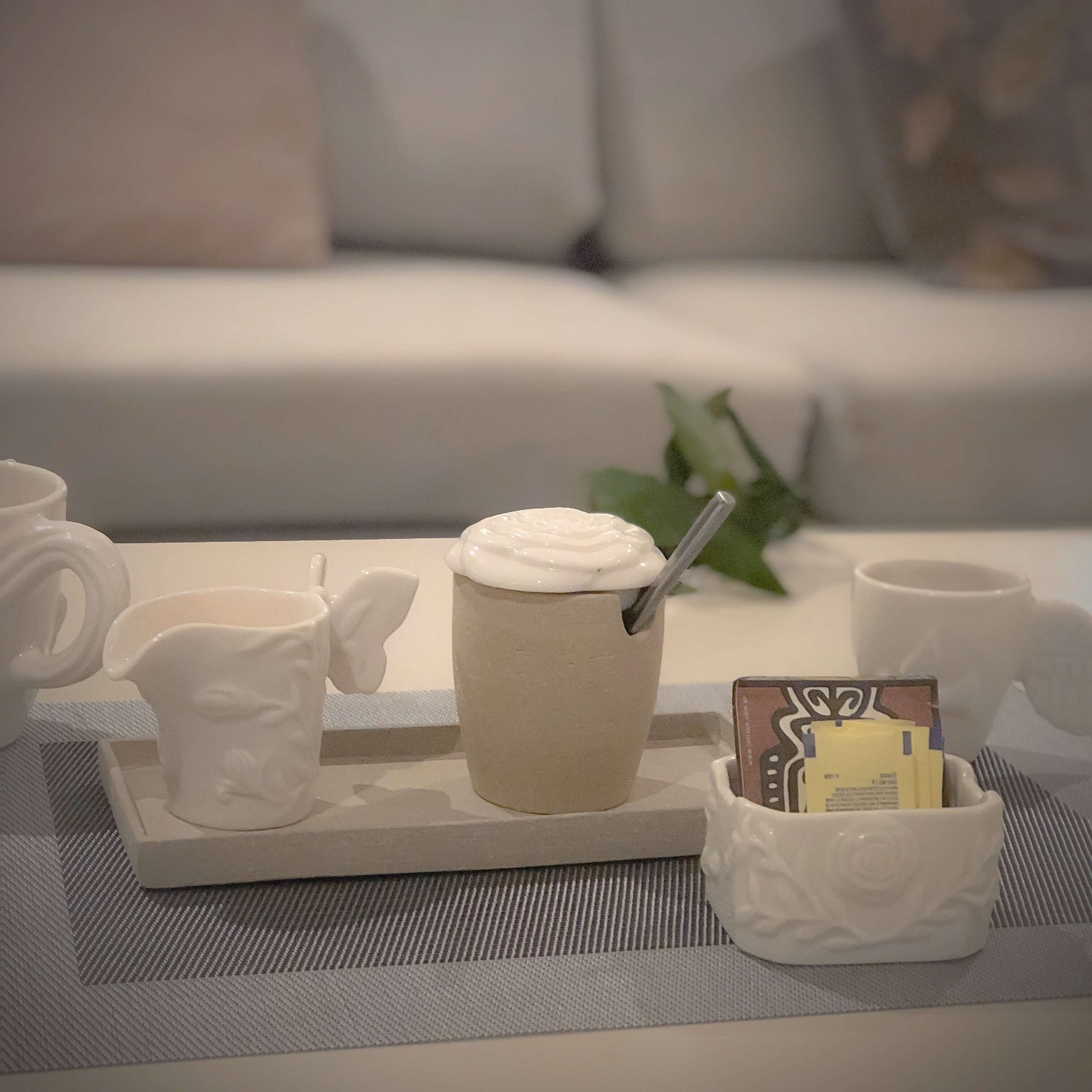 Set de tres piezas que combinan porcelana y arcilla natural, compuesto por una jarrita lechera, una azucarera y un porta sachets para filtrantes. Con detalles de plantas, flores y mariposas en alto relieve, este set es un lindo acompañamiento en las mesas de te o lonche. Piezas hechas a mano y horneadas a altas temperaturas.