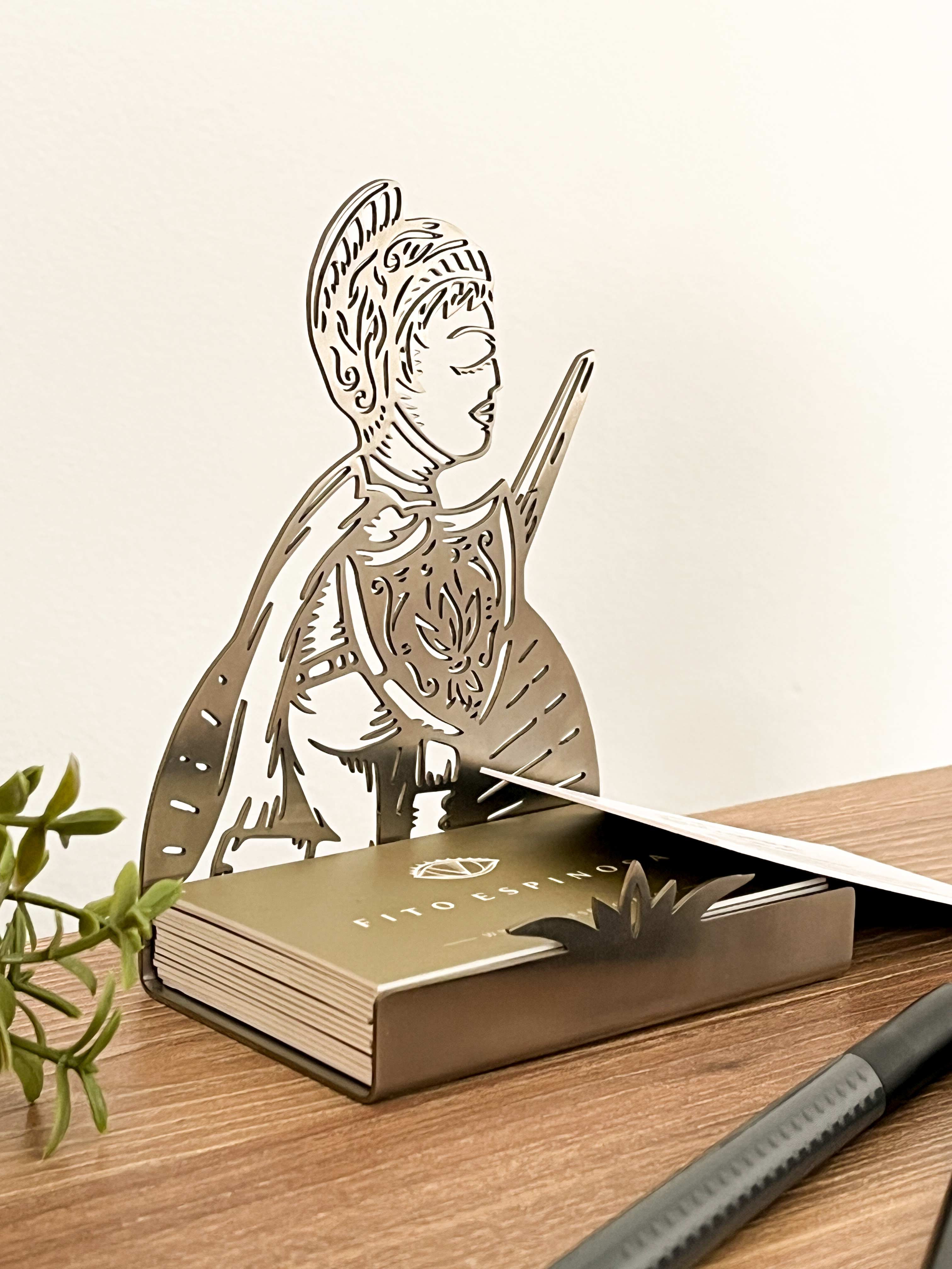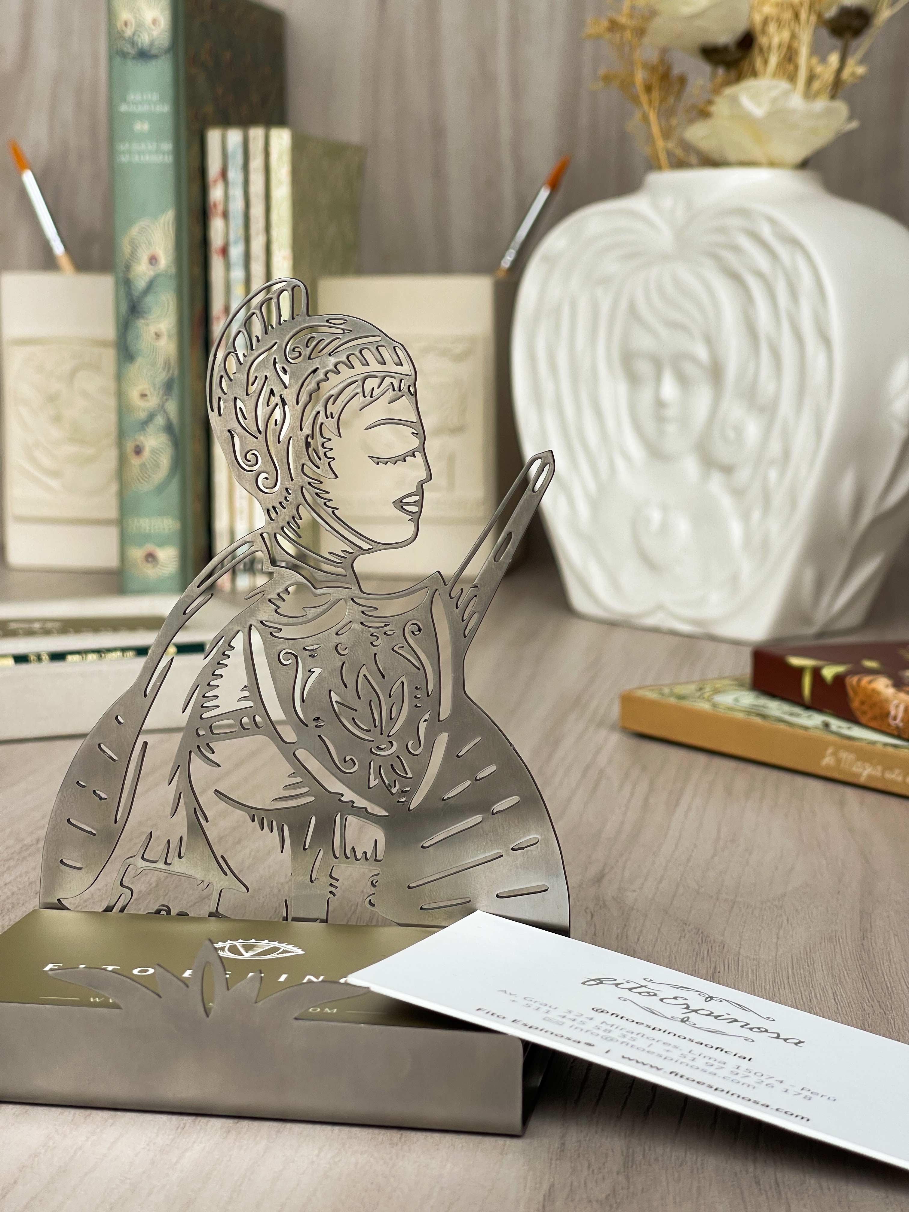Tarjetero calado en acero inoxidable inspirado en la ilustración “El Guerrero” de Fito Espinosa. Práctico, elegante y de estilo sobrio, es ideal como pieza de escritorio, oficina o estudio.