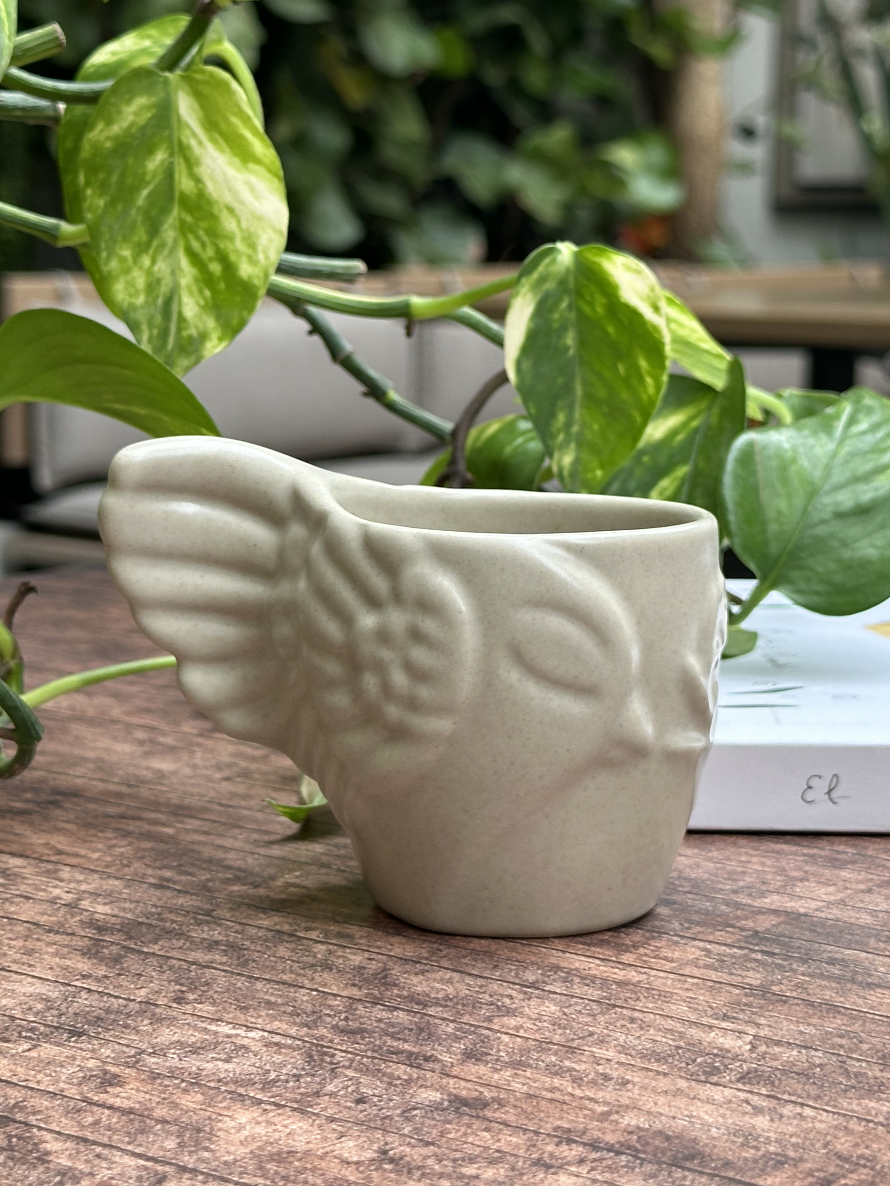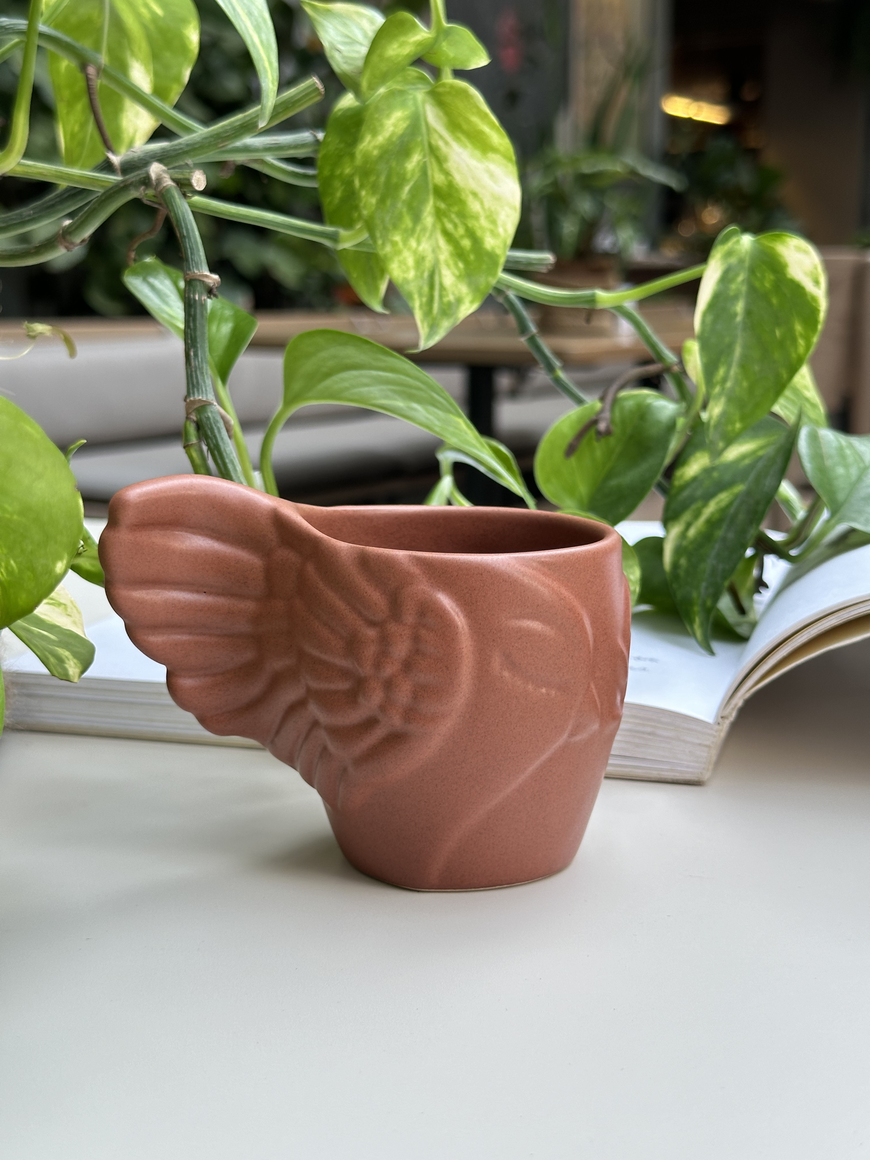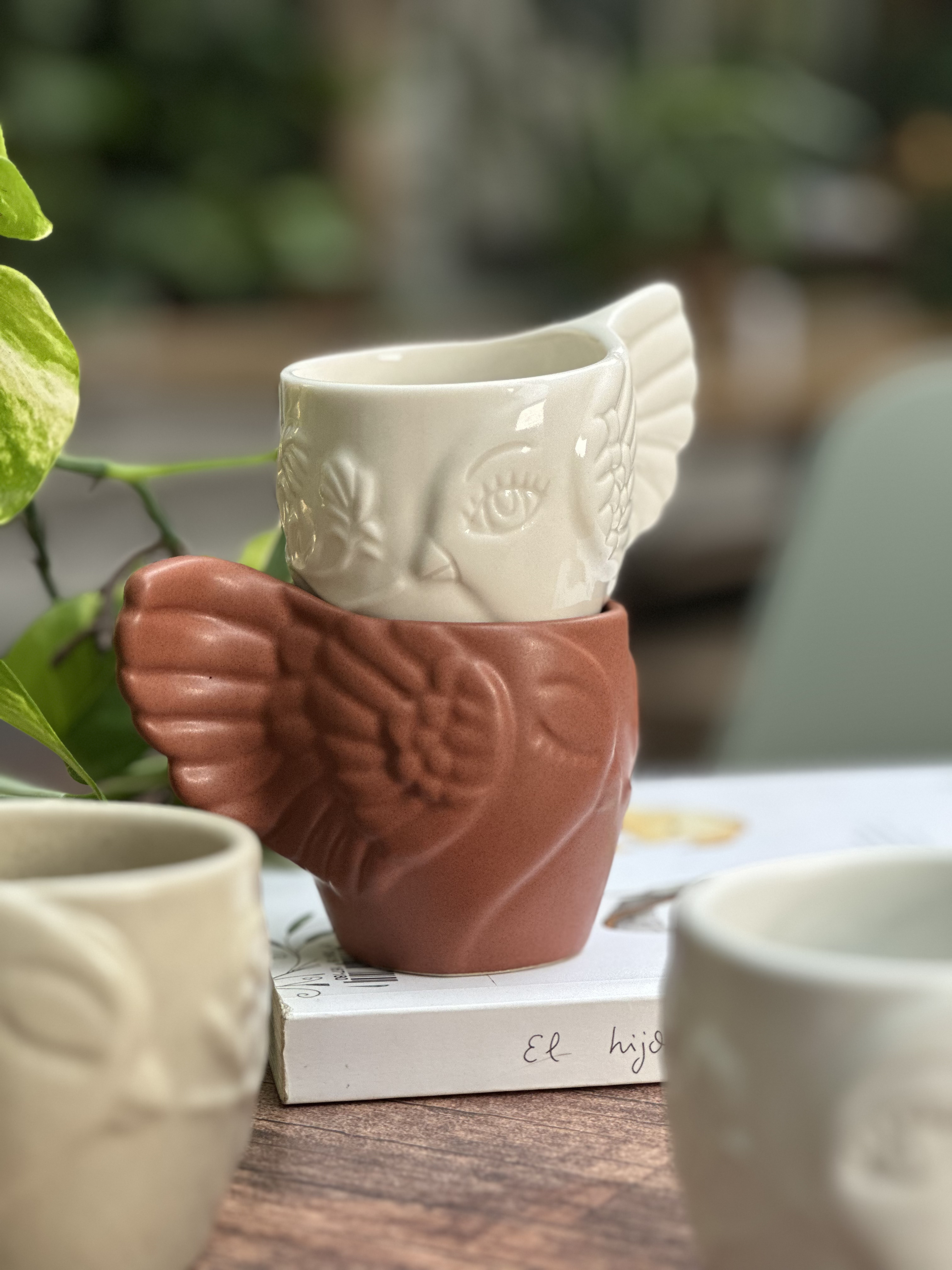 Tierna taza alada de tamaño pequeño en forma de gorrión, ideal para café cortado o expreso. Está hecha a mano en gres modelado en relieves, esmaltada con acabado mate en dos opciones de color: terracota y arena, y horneada a altas temperaturas.