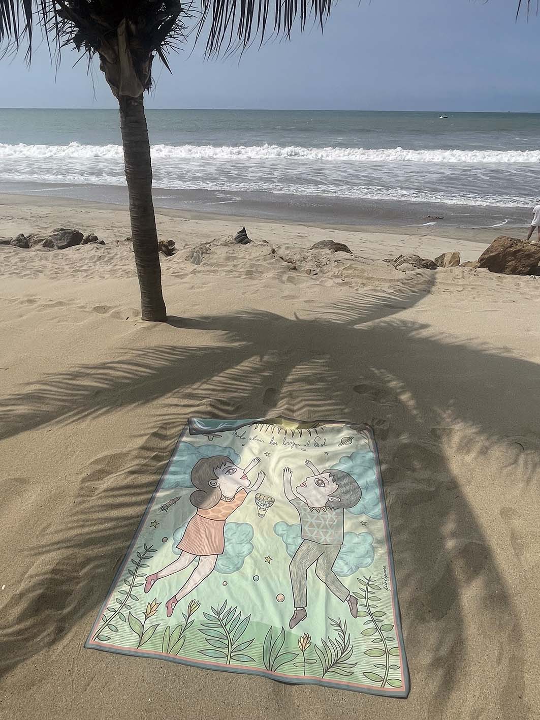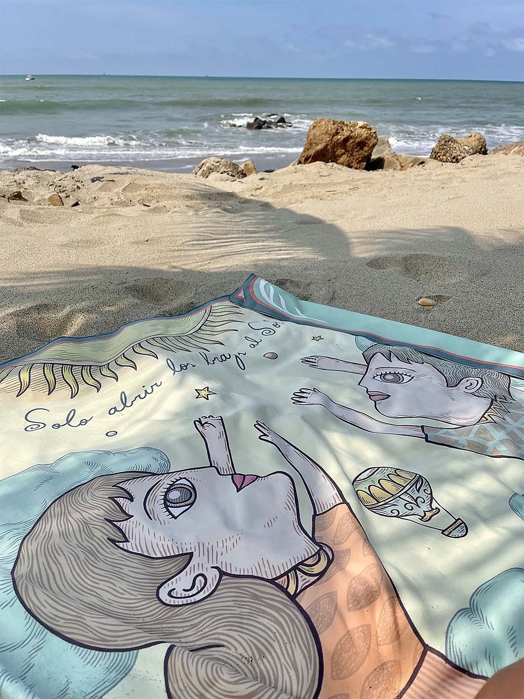 Toalla Reversible de Edición Limitada en formato grande, inspirada en la ilustración “Al Sol” de Fito Espinosa. Producto textil elaborado en microfibra ultrafina. Medidas: 160 x 110 cm