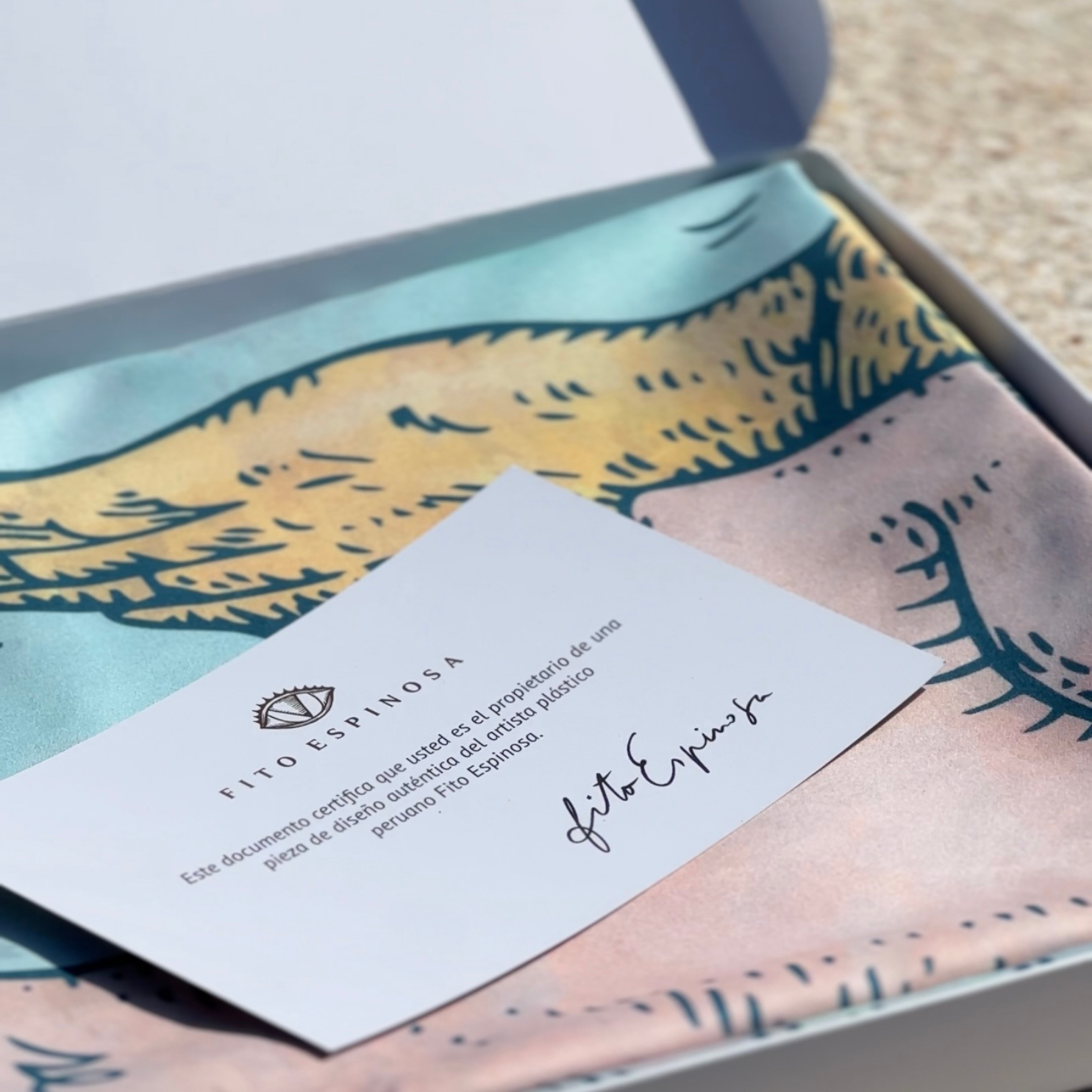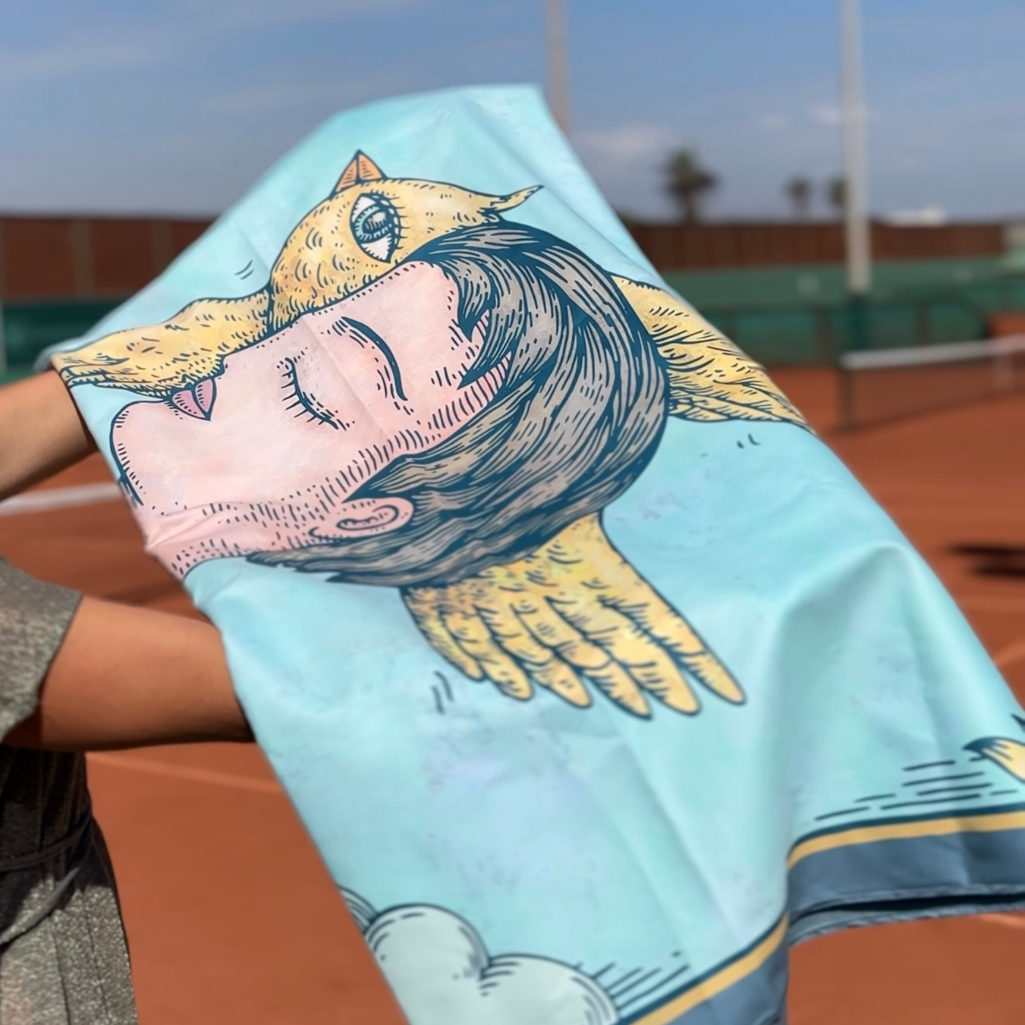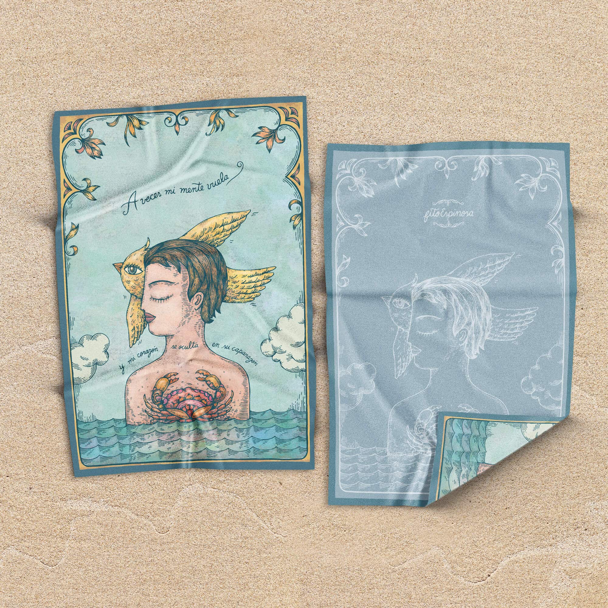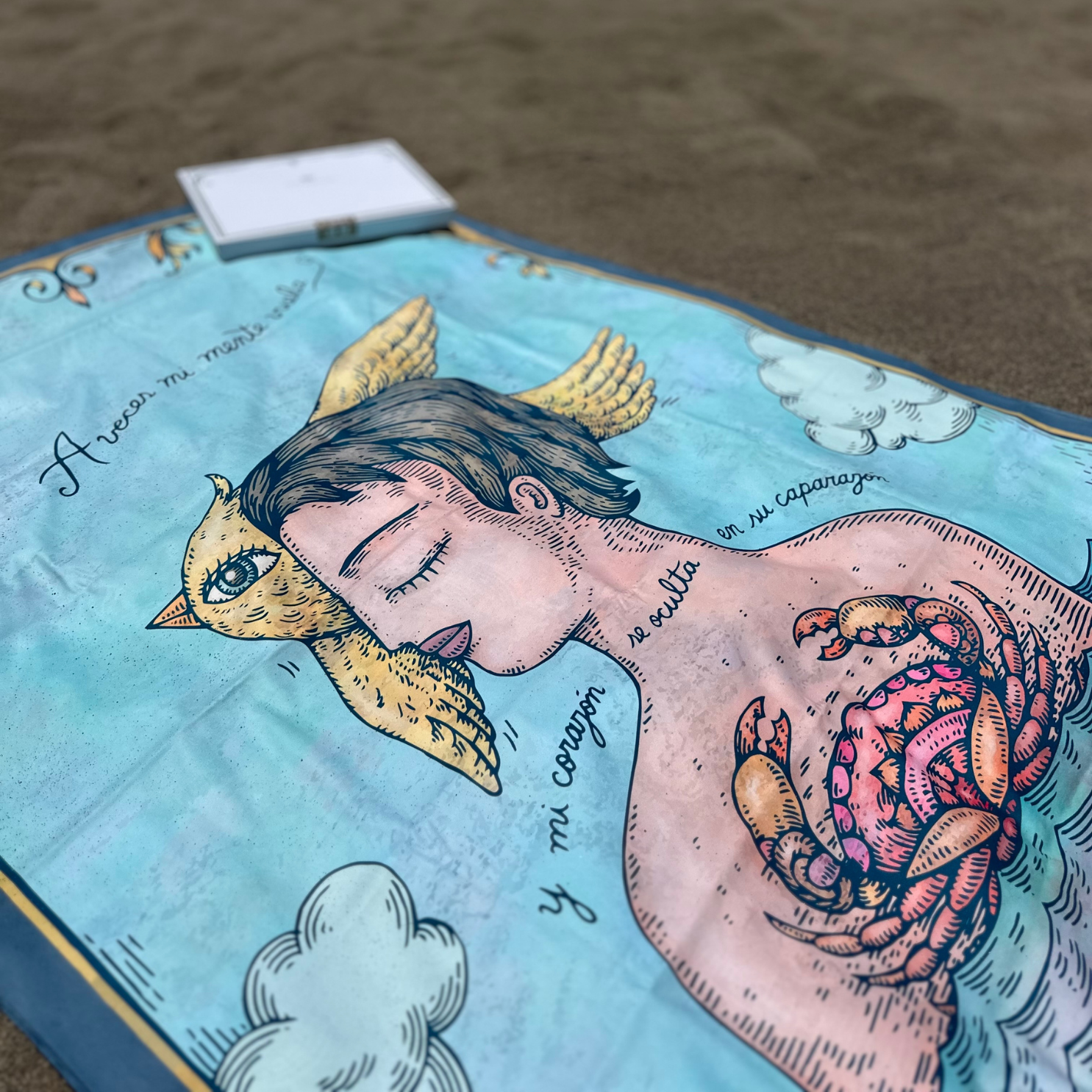 Toalla Reversible de Edición Limitada en formato grande, inspirada en la ilustración “Caparazón” de Fito Espinosa. Producto textil elaborado en microfibra ultrafina.