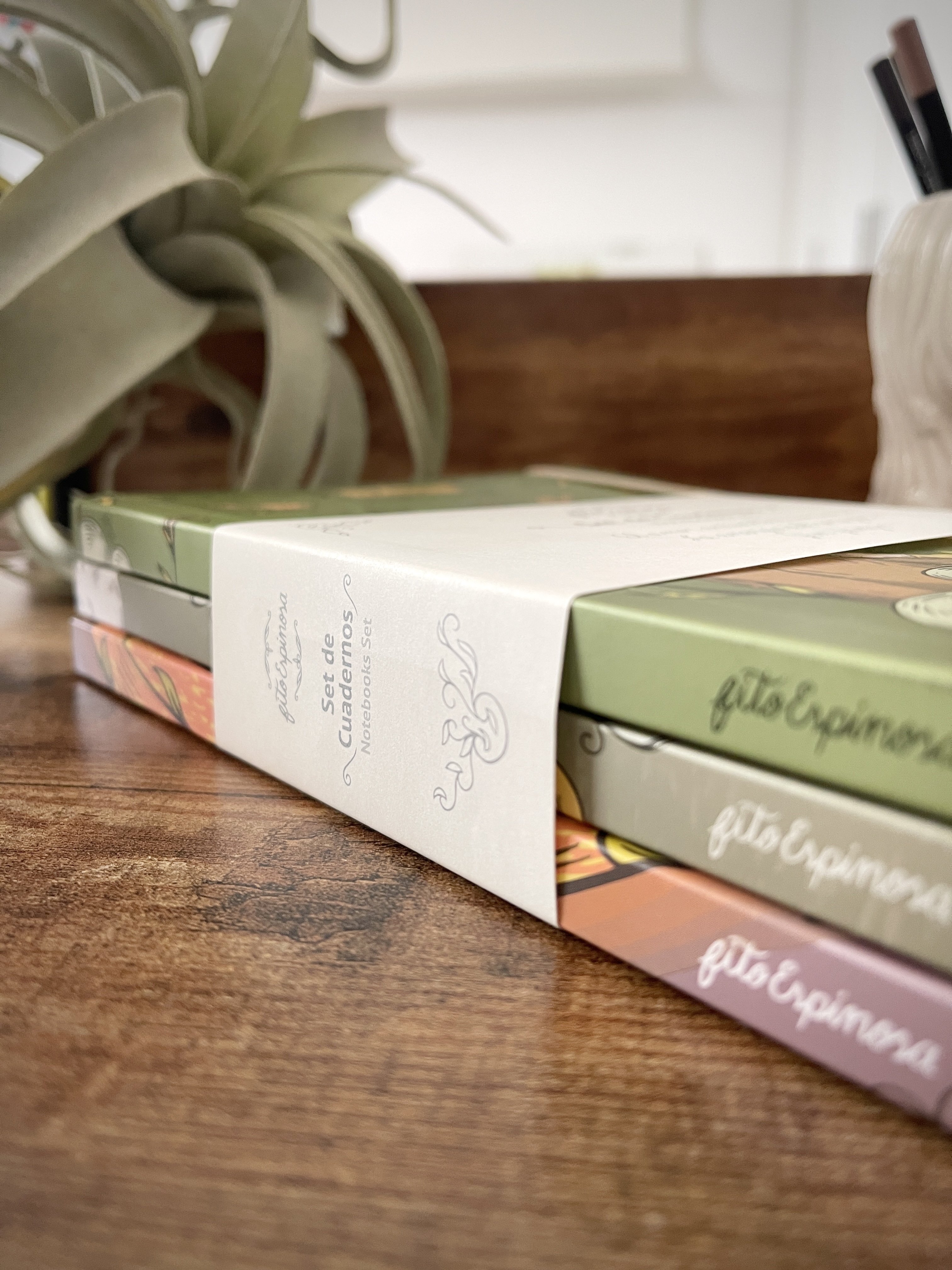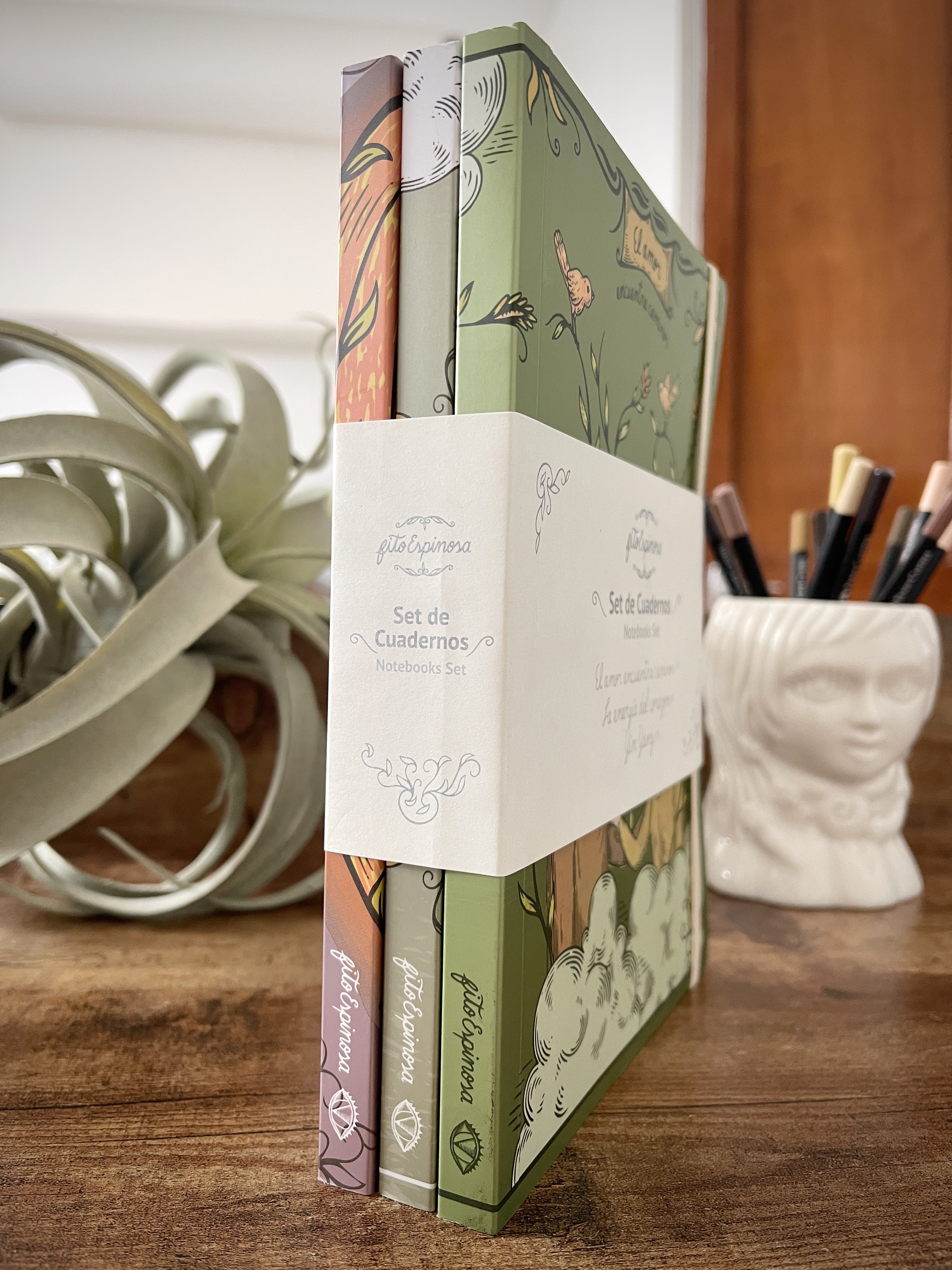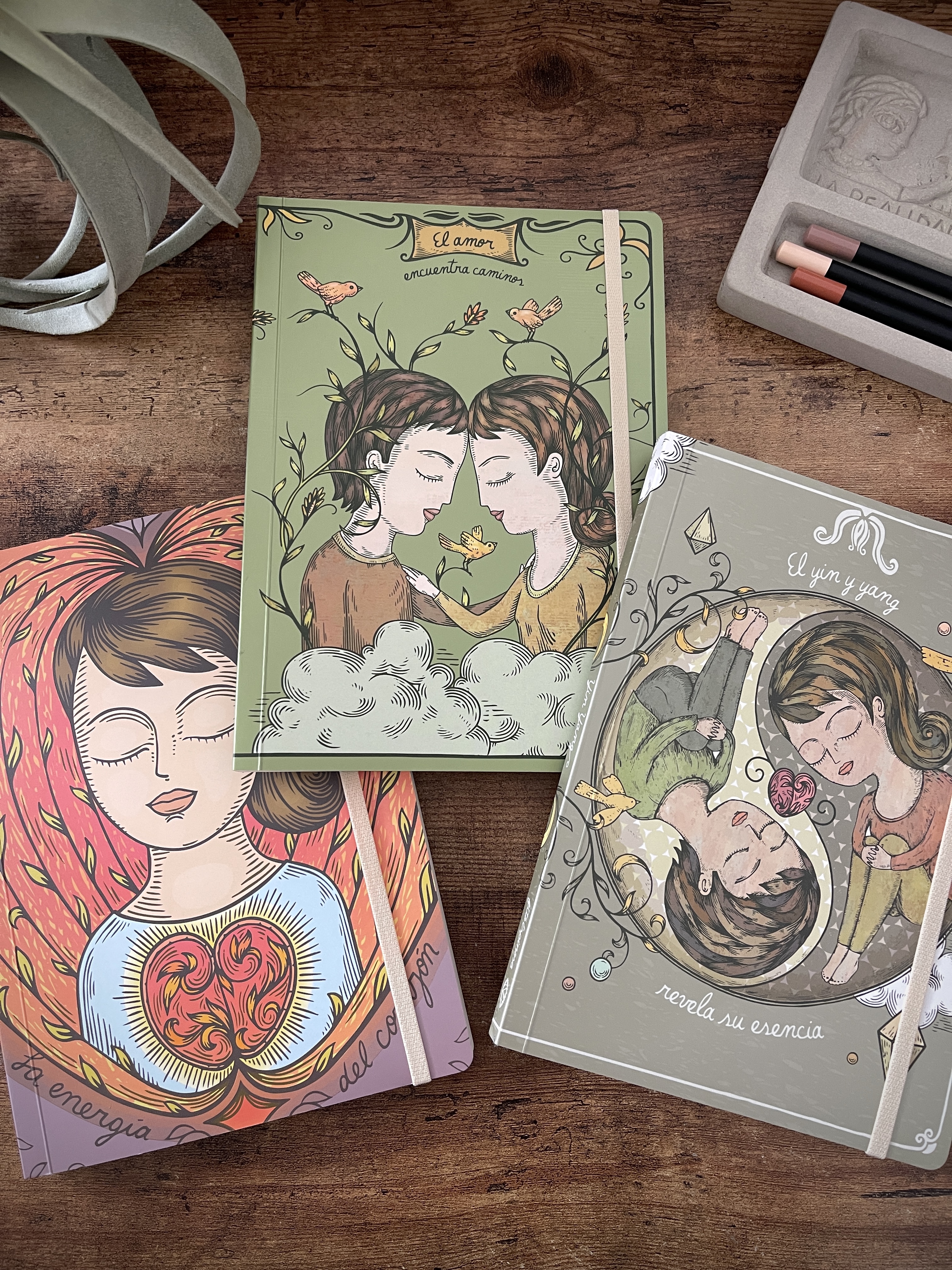 Cuadernos “Corazón”, “Yin Yang”, “Caminos” ~ Elaborados con papel avena fino de 85 grms, tapa blanda tamaño A5, elástico marcador y 180 páginas interiores en blanco ideales para escribir o dibujar. Las dos primeras páginas incluyen un encabezado y texto de Fito Espinosa, así como una ilustración a full color en exteriores.