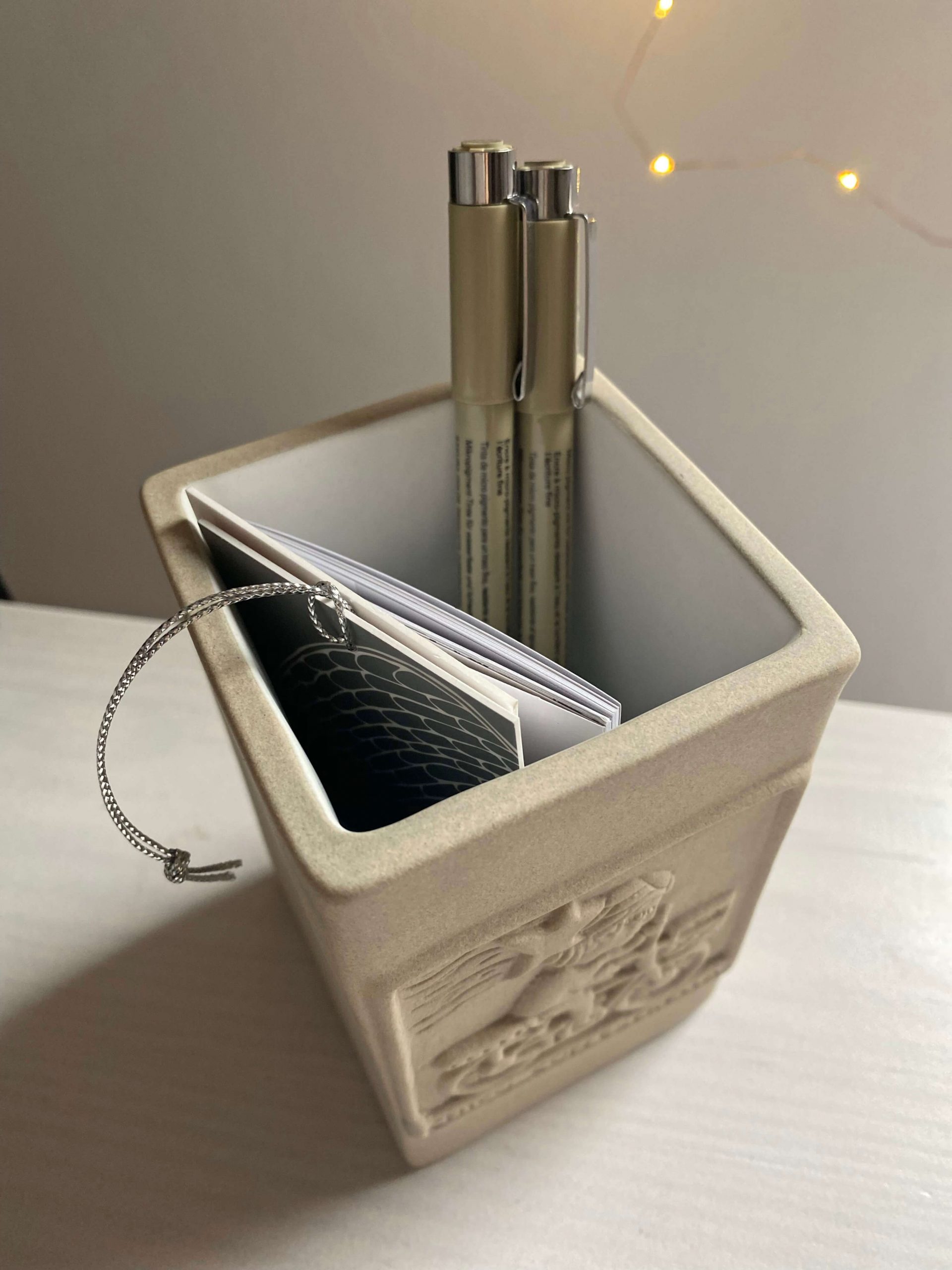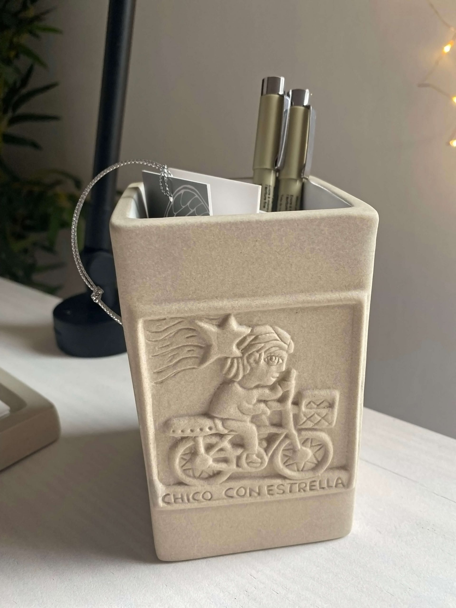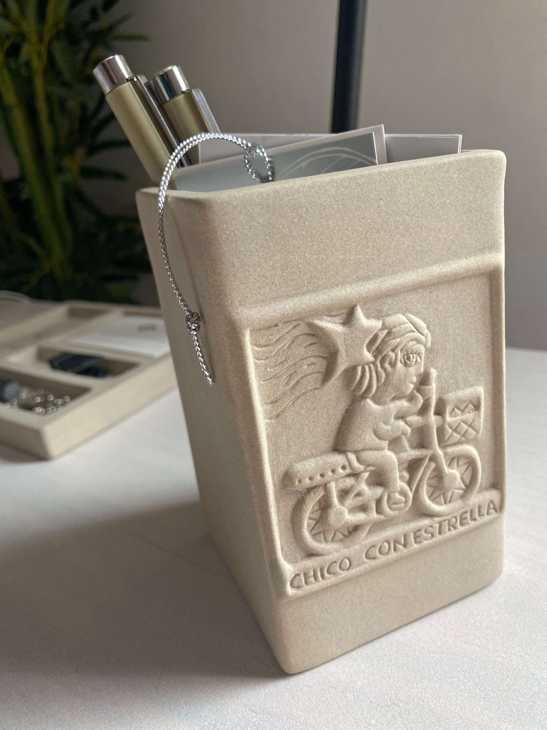 Vaso de escritorio lineal de forma rectangular. Elaborado en gres natural. Pieza modelada en bajo y alto relieve y horneada a altas temperaturas. Práctica, elegante y muy fácil de combinar, es adecuada para cualquier estilo de escritorio u oficina.