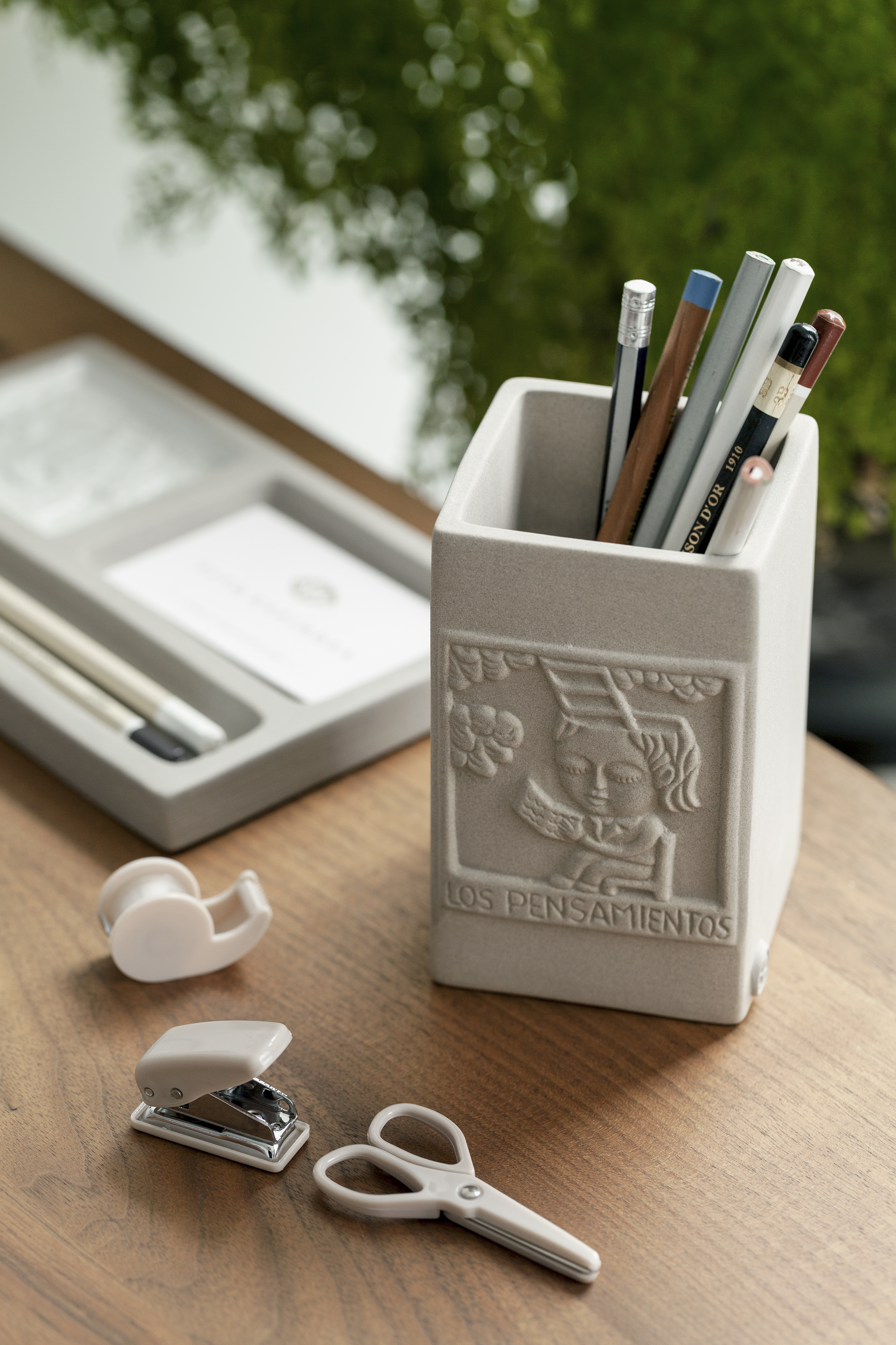 Vaso de escritorio lineal de forma rectangular. Elaborado en gres natural. Pieza modelada en bajo y alto relieve y horneada a altas temperaturas. Práctica, elegante y muy fácil de combinar, es adecuada para cualquier estilo de escritorio u oficina.