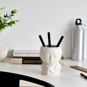 Portalápiz con detalles en alto relieve y bolsillo posterior muy práctico y útil para colocar clips u objetos pequeños. Hecho a mano en porcelana brillante y horneado a altas temperaturas.